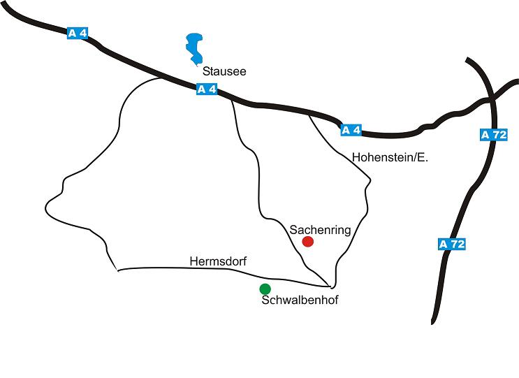 | Der Schwalbenhof liegt in der Ortsmitte von Hermsdorf. Die Ortschaft befindet sich zwischen der A4 und A72 in kurzer Entfernung zum Verkehrssicherheitszentrum auf dem Sachsenring in Hohenstein-Ernstthal. | |||||||