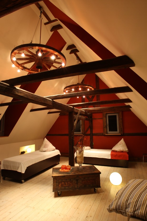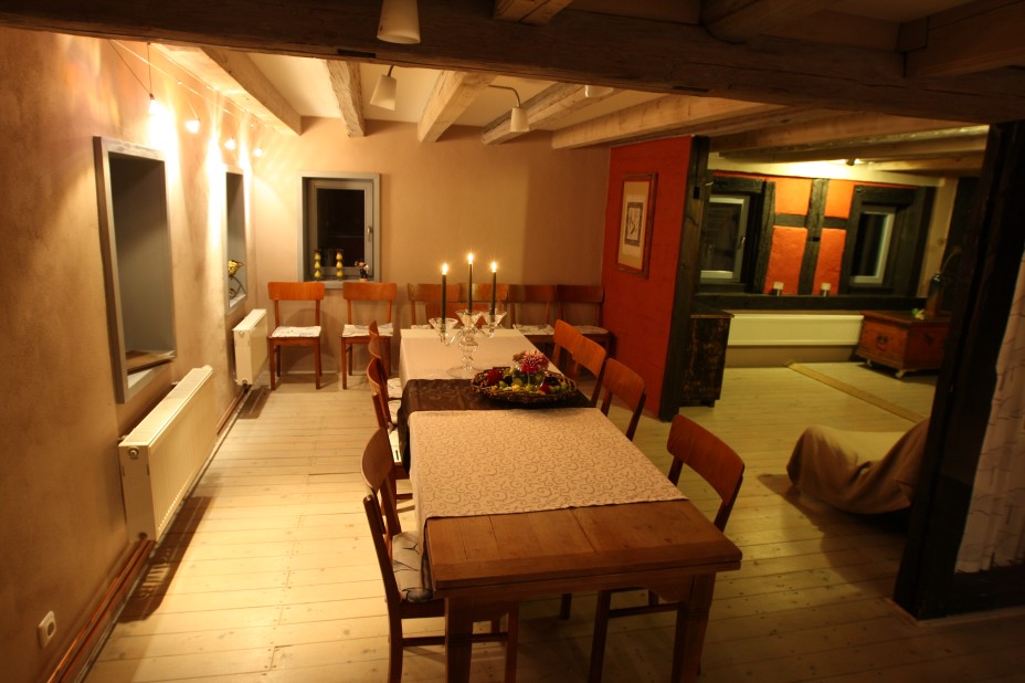 Übernachtung für Gruppen bis zu 8 Personen im Obergeschoss des Gebäudes in offenen Schlafnischen Aufbettung um weitere 4 Schlafplätze möglich 3 separate Bäder mit Flair (Dusche und Wanne) Großer Frühstücksraum mit Küche Das abgeschlossene Grundstück ist mit vielen Spiel- und Freizeitmöglichkeiten (Sandkasten, Tischtennis, Klettergerüst, Baumhaus, etc) ideal für Familien mit Kindern geeignet. Diese können zudem gern beim Füttern der Kleintiere (Dackel 'Biene', Katzen, Tauben, Hasen und Schafe) helfen. |